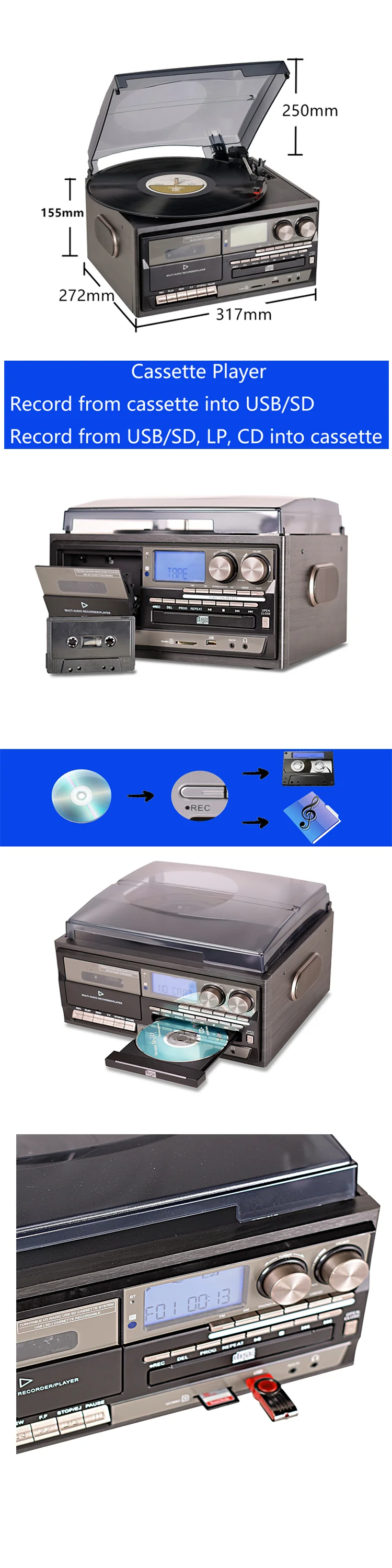 Function: CD play, Radio FM USB turntable record player; cassette and USB