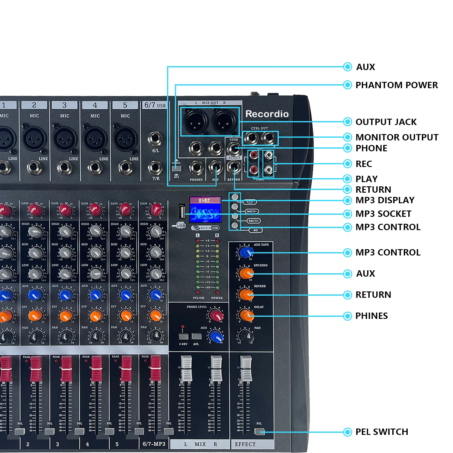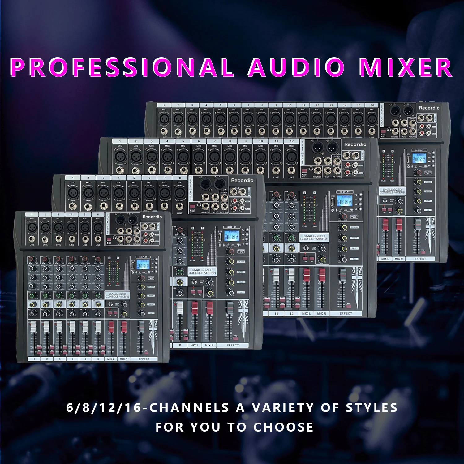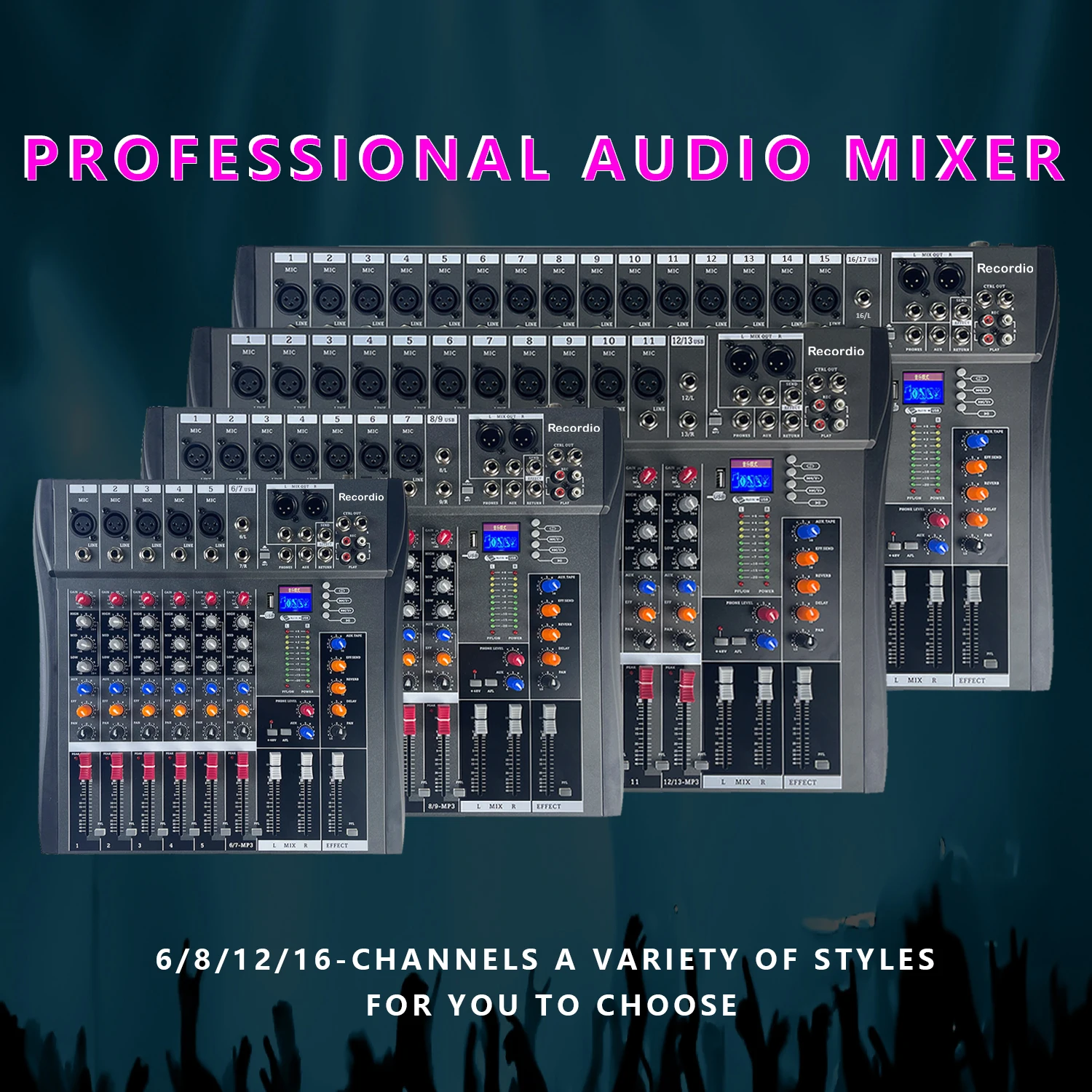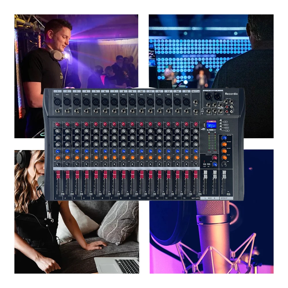 Mixing console with digital microphone 16 channels with USB BT 48 V Phantom Power Professional Karaoke DJ Audio Mixer